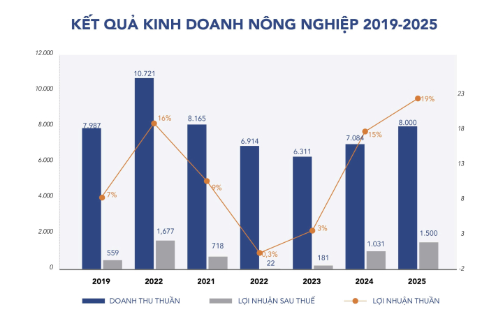 Năm 2024, Nông nghiệp Hòa Phát ghi nhận doanh thu thuần 7.084 tỷ đồng, tăng 12,3% so với năm 2023. Lợi nhuận sau thuế đạt 1.031 tỷ đồng, tăng 84% so với năm trước. Biên lợi nhuận thuần ở mức 15,1%. Kết quả kinh doanh giai đoạn 2019-2024 ghi nhận sự tăng trưởng rõ rệt. Biên lợi nhuận thuần từ mức 7% năm 2022 đã tăng lên 15% năm 2024. Theo kế hoạch năm 2025, chỉ số này có thể đạt 19%.