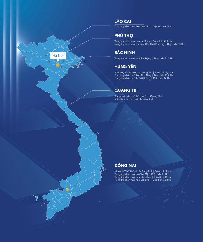 Sau 10 năm, Nông nghiệp Hòa Phát đã xây dựng được hệ thống khép kín phủ khắp 8 tỉnh thành. Cụ thể, Hòa Phát có 2 nhà máy sản xuất thức ăn nuôi tại Hưng Yên và Đồng Nai với tổng công suất 600.000 tấn mỗi năm; 07 trang trại chăn nuôi heo tại Lào Cai, Bắc Ninh, Hưng Yên, Phú Thọ, và Đồng Nai; 03 trang trại chăn nuôi bò tại Hưng Yên, Quảng Trị và Đồng Nai; 02 trang trại gà tại Phú Thọ với quy mô 1,2 triệu gà mái.