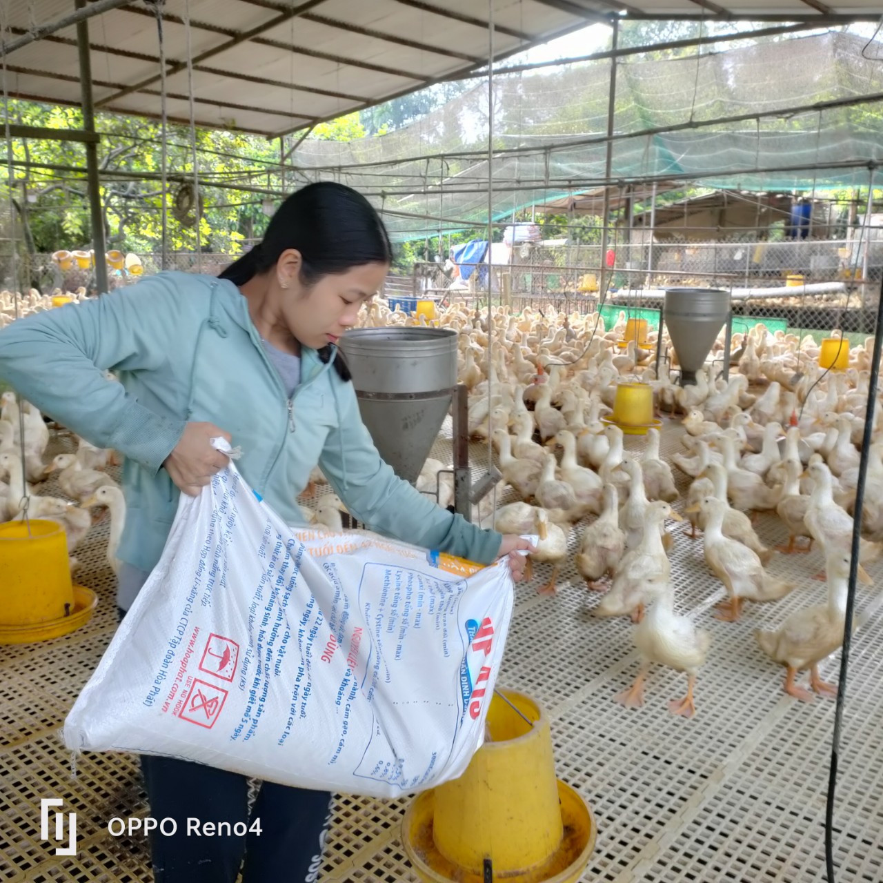 Chị Lý thường sử dụng các sản phẩm cám 40S và 41s của Thức ăn chăn nuôi Hòa Phát Đồng Nai. Hai dòng sản phẩm này là dòng thức ăn hỗn hợp hoàn chỉnh cho vịt siêu thịt từ 1 ngày đến 21 ngày tuổi và từ 22 ngày đến xuất chuồng. Sản phẩm cám có hàm lượng dinh dưỡng cao giúp vịt tăng trưởng nhanh, bổ sung đầy đủ khoáng chất, vitamin, tăng sức đề kháng, phòng bệnh. Bên cạnh đó, sản phẩm còn giúp cân đối năng lượng và acid amin, bổ sung acid béo thiết yếu. Khi sử dụng, vịt khỏe mạnh, đồng đều, khung xương chắc khỏe, tăng trưởng nhanh với FCR tốt nhất. Tỷ lệ loại thải thấp, phát triển lông tối đa.